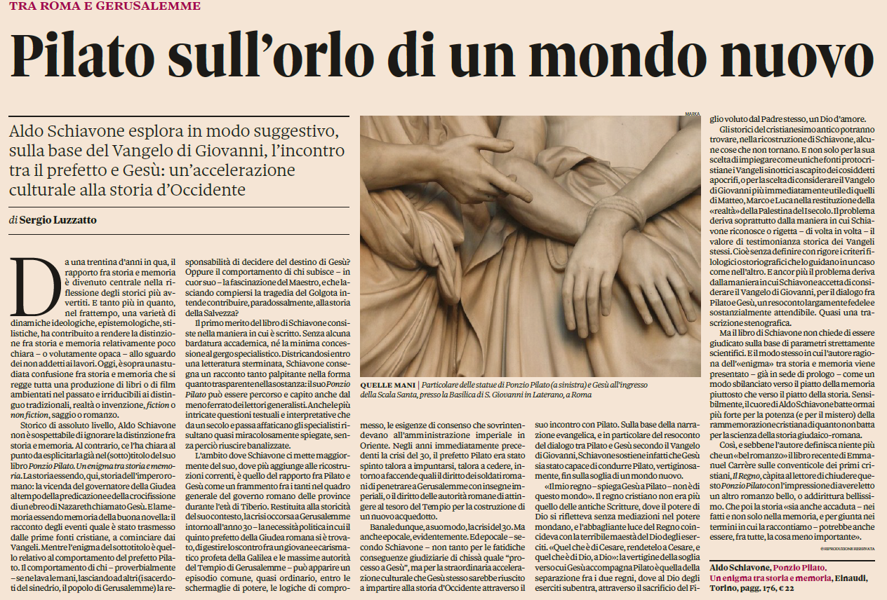 Da duemila anni Pilato è una figura di intersezione fra memoria e storia, come Romolo o Giovanna d’Arco. Il racconto di Schiavone è in gran parte un viaggio nella prima memoria cristiana, che, nel suo punto culminante, la morte di Gesú, si interseca con la storia dell’impero romano. Pilato è l’unico personaggio storico cui la memoria evangelica abbia attribuito un lungo dialogo con Gesú, non si sa in quale lingua. Ogni fase, ogni parola della vicenda è stata discussa, accettata, respinta, riscritta dalla ricerca moderna.